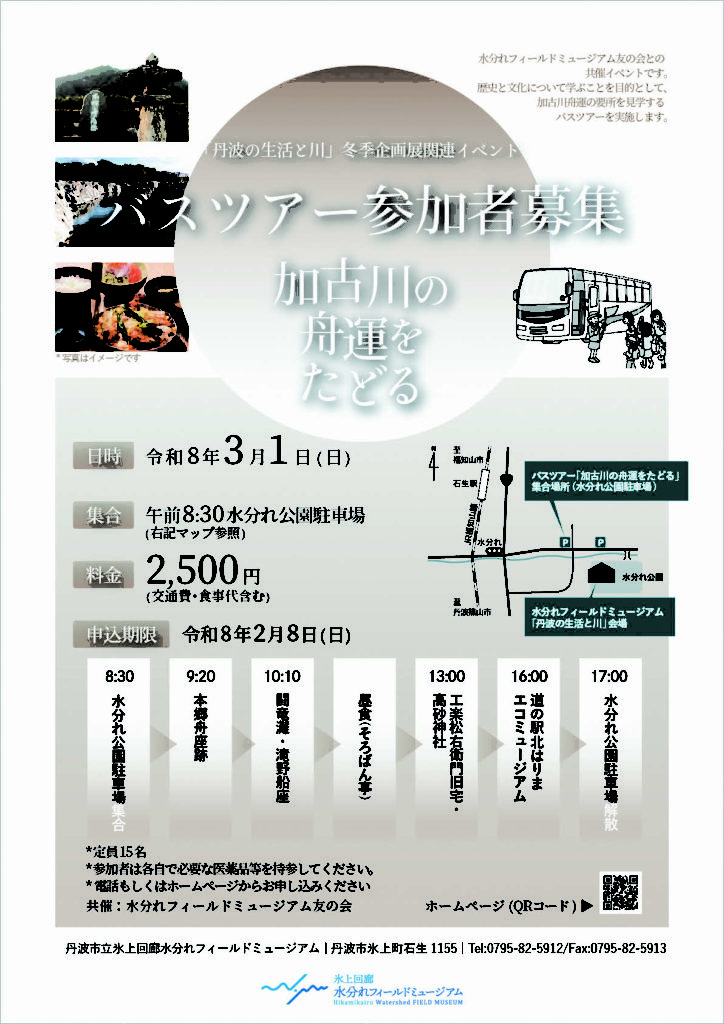 定員:15名 集合:午前8時30分水分れ公園駐車場 行程:8:30 水分れ公園駐車場集合 9:20 本郷舟座跡 10:10 闘竜灘・滝野舟座 (昼食) 13:00 高砂神社・工楽松右衛門旧宅 16:00 道の駅北はりまエコミュージアム 17:00 水分れ公園駐車場 料金:1人2,500円 ※交通費・食事代含む 申込期限:令和8年2月8日(日) ※複数で申し込みをされる場合は、同行される方の お名前とフリガナ、連絡先を申し込みフォームの 「その他(任意)」の欄にご記入ください。 (バスの乗車名簿作成に必要になります)