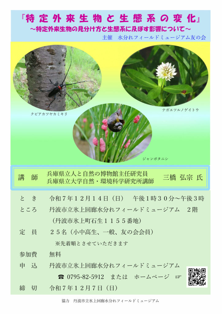 兵庫県立人と自然の博物館主任研究員の三橋弘宗さんを講師におまねきして、特定外来生物の見分け方と生態系に及ぼす影響について解説していただきます。