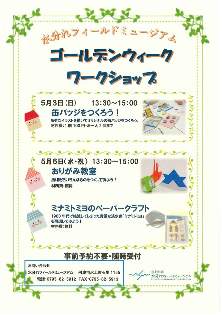 ①5月3日(日)開催 缶バッジをつくろう! 好きなイラストを描いてオリジナルの缶バッジを つくろう。 日 時:5月3日(日)13:30~15:00 場 所:水分れフィールドミュージアム 2階 申 込:不要・随時受付 材料費:1個 100円(おひとり2個まで) (ミュージアム1階常設展は、大人210円、小・中学生100円) ※ココロンカード提示で小中学生は無料 ②5月6日(水・祝)開催 折り紙教室 折り紙でいろんなものをつくってみよう! 日 時:5月6日(水・祝)13:30~15:00 場 所:水分れフィールドミュージアム 2階 申 込:不要・随時受付 材料費:無料 (ミュージアム1階常設展は、大人210円、小・中学生100円) ※ココロンカード提示で小中学生は無料 ③5月6日(水・祝) 開催 ミナミトミヨのペーパークラフト 1960年代で絶滅してしまった貴重な淡水魚「ミナミトミヨ」 を再現してみよう! 日 時:5月6日(水・祝)13:30~15:00 場 所:水分れフィールドミュージアム 2階 申 込:不要・随時受付 材料費:無料 (ミュージアム1階常設展は、大人210円、小・中学生100円) ※ココロンカード提示で小中学生は無料