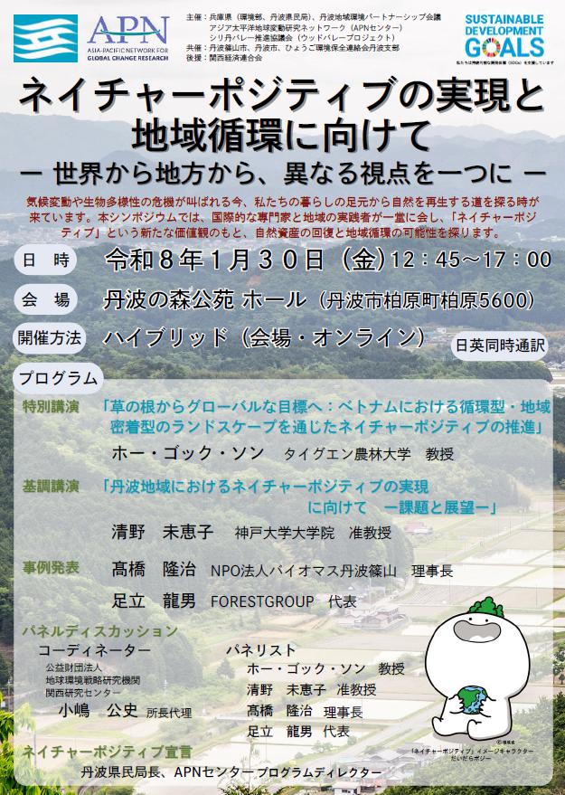 兵庫県(環境部・丹波県民局)や丹波地域環境パートナーシップ会議等が主催(共催:丹波市、丹波篠山市等)する国際シンポジウム「ネイチャーポジティブの実現と地域循環に向けて」を開催します。