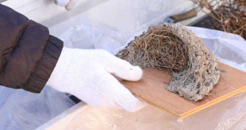 帰り道は高谷川の土手にアオサギやウグイスが出現しました。水分れ橋付近でカワガラスがほんの一瞬姿を現しましたが「高谷川では、はじめて確認した」とのこと。最後は梅津さんが収集した鳥の羽や巣に実際に触れながら、丹波の野鳥についてのレクチャーを受け、この日見つけた鳥をおさらい。姿を確認したのは28種類、声だけ聞こえたのが1種類。わずか2~3時間の短い時間で、約30種類もの鳥たちに出会うことができました。