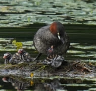 そして目的地の調整池へ。ここにはカルガモ、ヒドリガモ、コガモ、オカヨシガモ、オナガガモ、ハシビロガモといったカモの仲間が悠々と泳ぎ、コサギ、ダイサギも羽を休めています。みな思い思いに双眼鏡を覗きながらしばらく観察。「あ、オオバンがいる!」と、子どもたちも楽しそう。